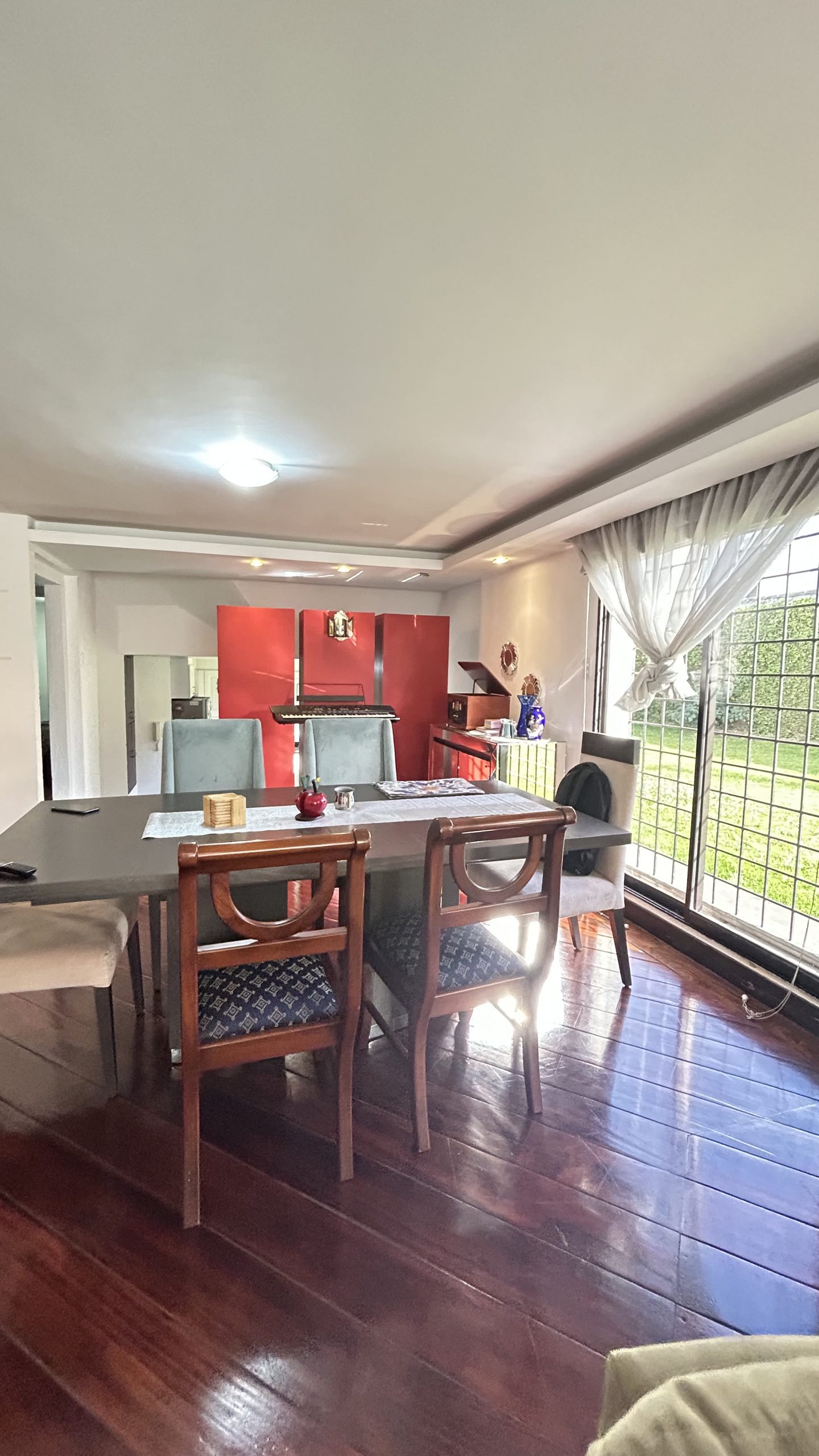 Sala comedor con piso de madera chanull lacado y puerta de acceso al área verde comunal lateral